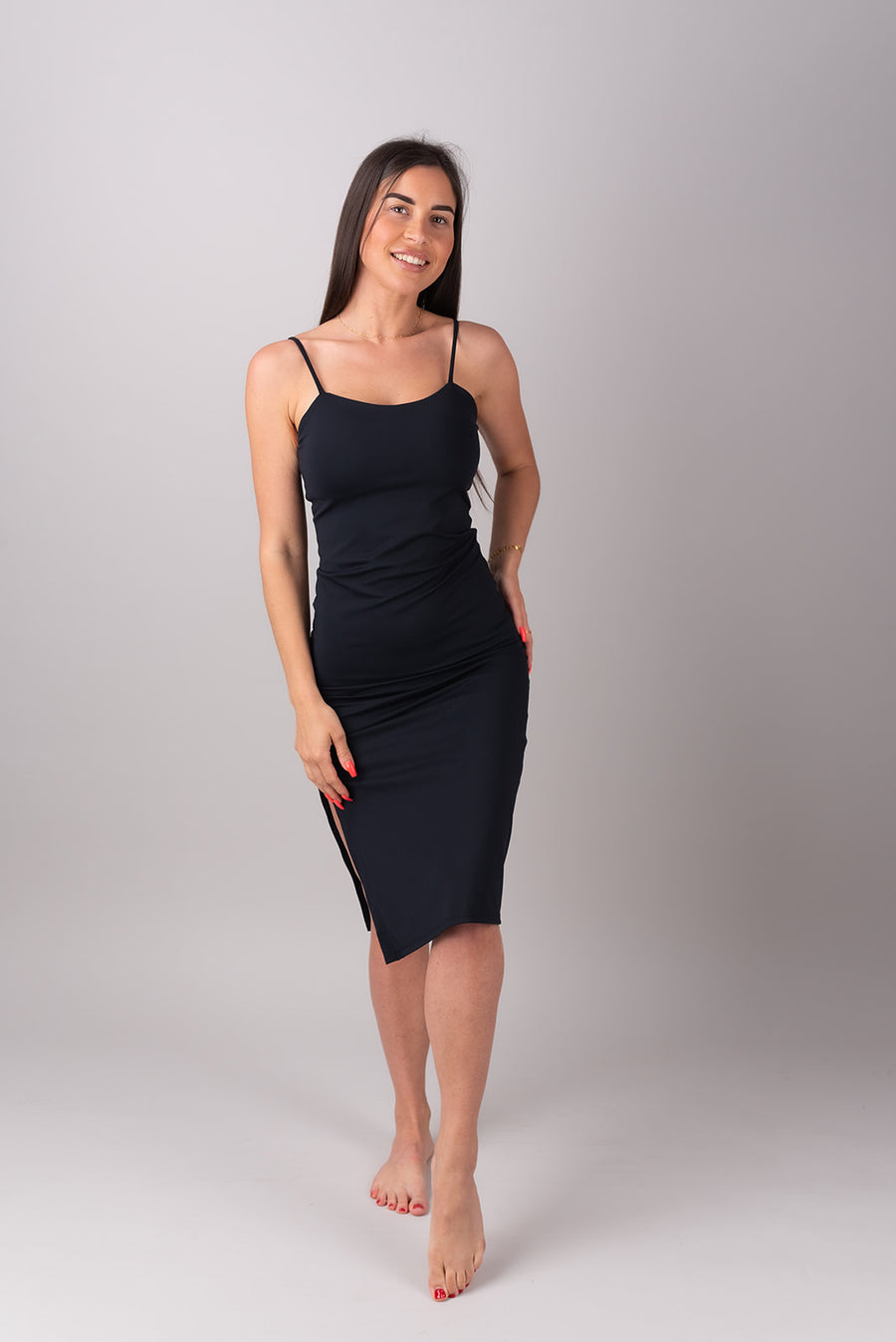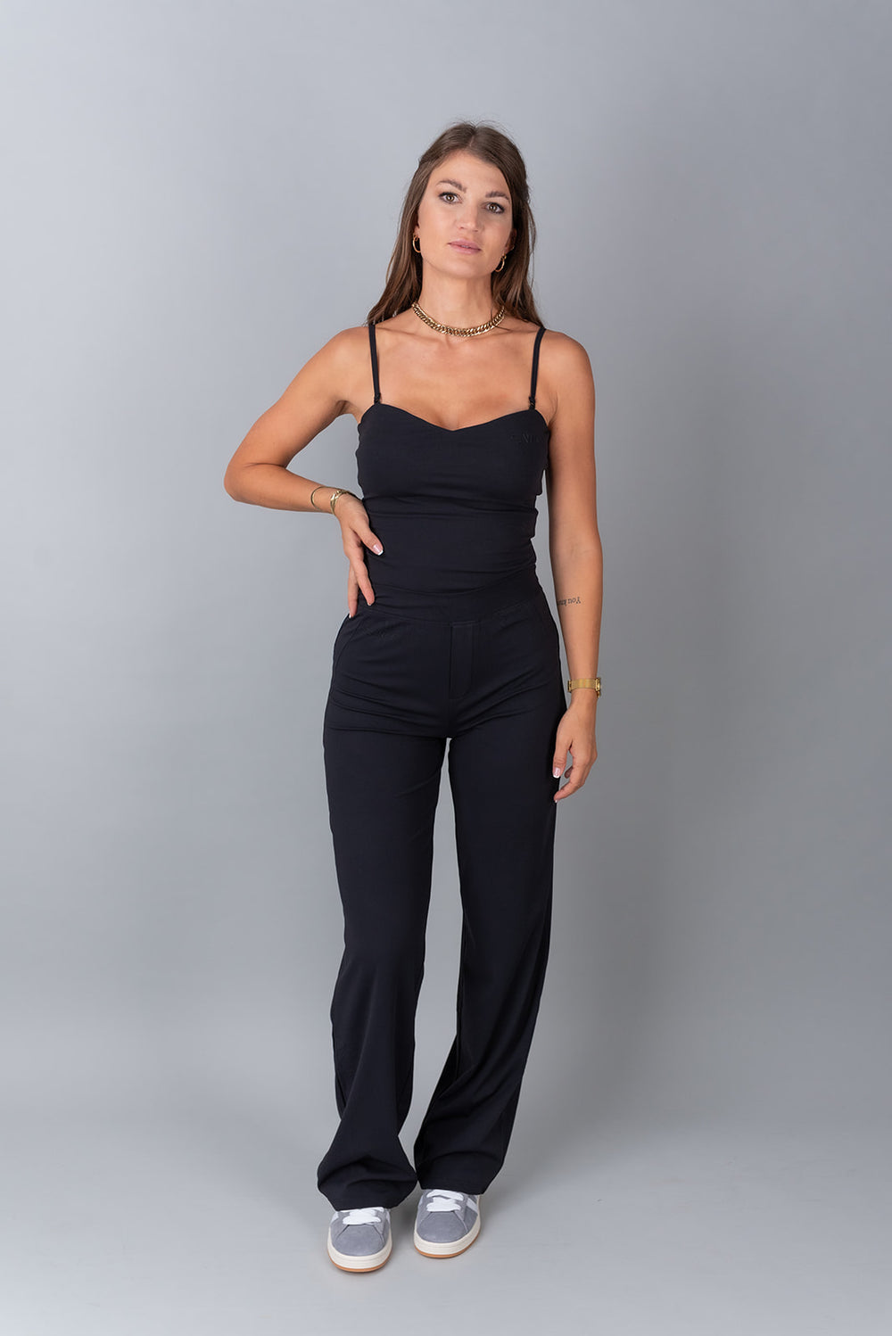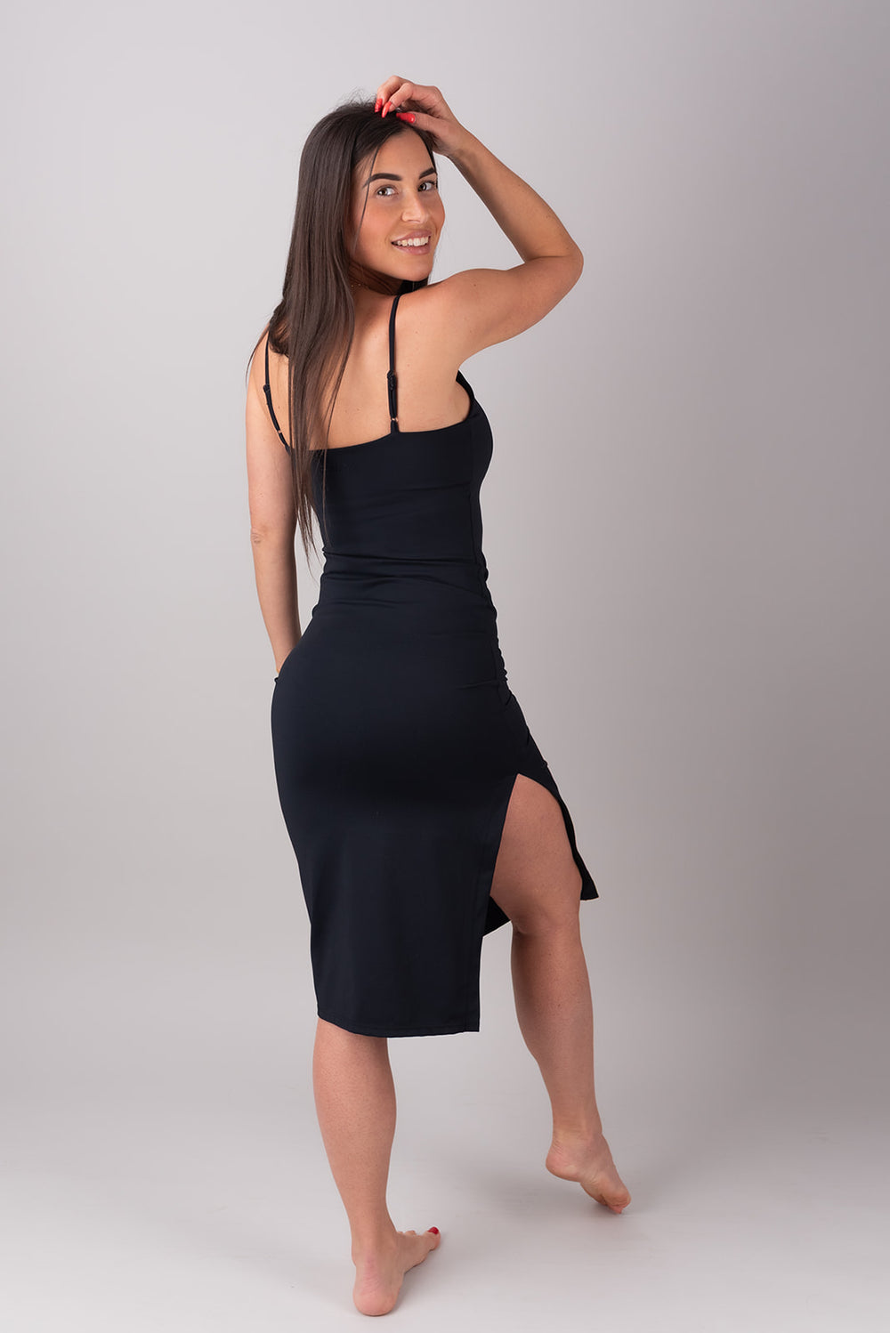 Questa canotta è progettata per valorizzare la parte superiore del corpo con una scollatura morbida e arrotondata e una vestibilità modellante che esalta le curve naturali. Dotata di un reggiseno invisibile integrato con coppe rimovibili e dettagli discreti, offre comfort per tutto il giorno grazie al tessuto leggero ed elasticizzato.
