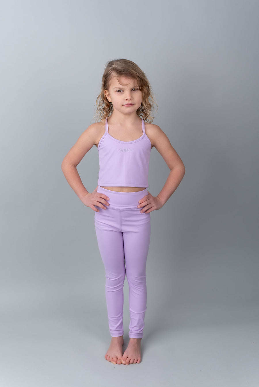 Il nostro primo set per ragazze, composto da leggings e top, adatto a diverse attività come yoga, danza, andare in bicicletta e l’uso quotidiano.
